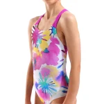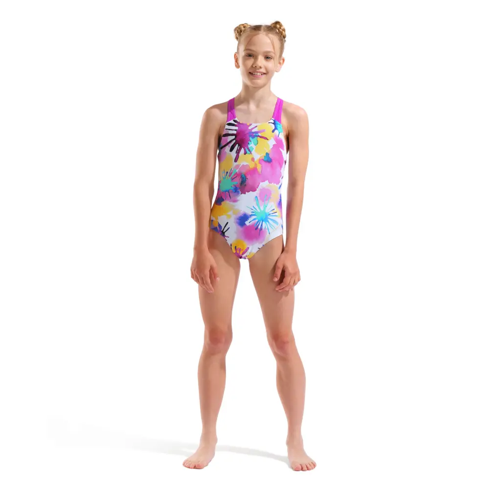 Διαθέτει το σχέδιο “Spraying” σε λευκό φόντο με πολύχρωμες λεπτομέρειες (White-Multi) και έντονο φούξια (Very Fuchsia). Η πλάτη είναι τύπου Swim Pro, που προσφέρει σταθερότητα και ελευθερία κινήσεων.
